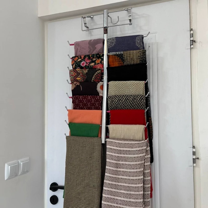 آویز استیل چندکاره، مناسب برای آویزان کردن شال، روسری، شلوار و لباسهای سبک. نصب آسان روی درب کمد یا اتاق. ساختهشده از استیل بادوام با روکش محافظ.